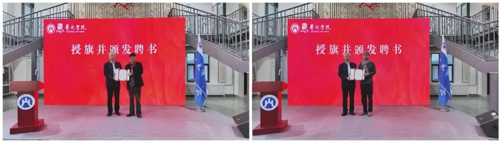 张新为校友分会授旗,并向名誉会长和会长颁发聘书。