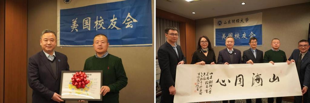 查玉喜与董德华代表学校与校友会互赠礼物。查玉喜向新当选的美国校友会会长、副会长、秘书长颁发聘书。
